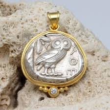 It was our last night on our family vacation in Hawaii and we all gathered at the local shops for one last glance before the last supper. We had barely walked through the entrance to the shops when something in the store window caught my eye. Yes, it was what I thought, what looked like an old coin had been turned into a necklace, in fact there were several. I immediately walked in, despite my normal hesitation of not wanting to be “on the hook”, I asked the saleswoman if I could see the necklaces and learn more about their history. While several were quite captivating, there was one I couldn’t keep my eyes off. A beautiful owl with large eyes starring back at me was beckoning my attention. Of course, this was the most sought after and valuable of them all, but for me none of that mattered, it was the connection I felt to the heavy coined necklace that kept me asking more questions. The Athenian “owl” silver tetradrachm coin, as it turns out, was an original from approximately (449-404BC) and is “one of the most influential coins of all time.” In fact, this was the first coin used in international trade and was used to finance large construction projects and even war. The coin bears the helmeted head of Athena on one side and two symbols of the goddess, an owl and an olive branch, on the other. In Greek mythology, Athena, the goddess of wisdom and just warfare, rivaled Zeus himself in power and wisdom. It was Athena who gave the people of Attica the olive-tree. The owl is not only Athena’s mascot but, at times, took the form of the owl herself. In Roman times the owl also become known as the “Minerva Owl” and its history and symbology continued to grow. Once we left the store, I couldn’t get the precious coin out of my mind. As I blanketly starred at the merchandise in the other stores and finished off my dinner I knew there was no choice but return to the jewelry shop and gather up what felt like, something that belonged to me.